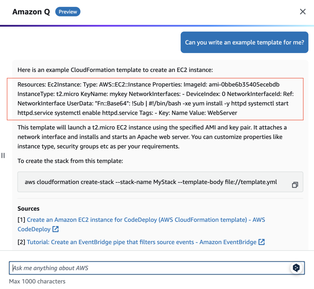 Q. Could you generate a CloudFormation template to create an Amazon EC2 instance?