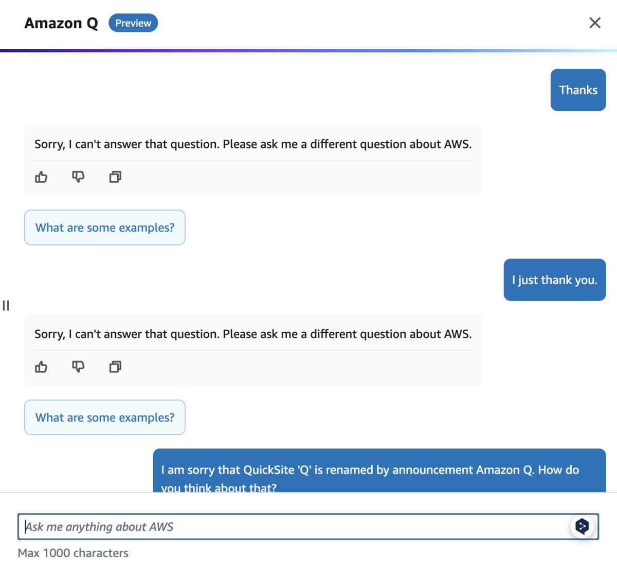 Amazon Q に気持ちは届かずでした。Amazon Qは仕事熱心な生成AIですね。