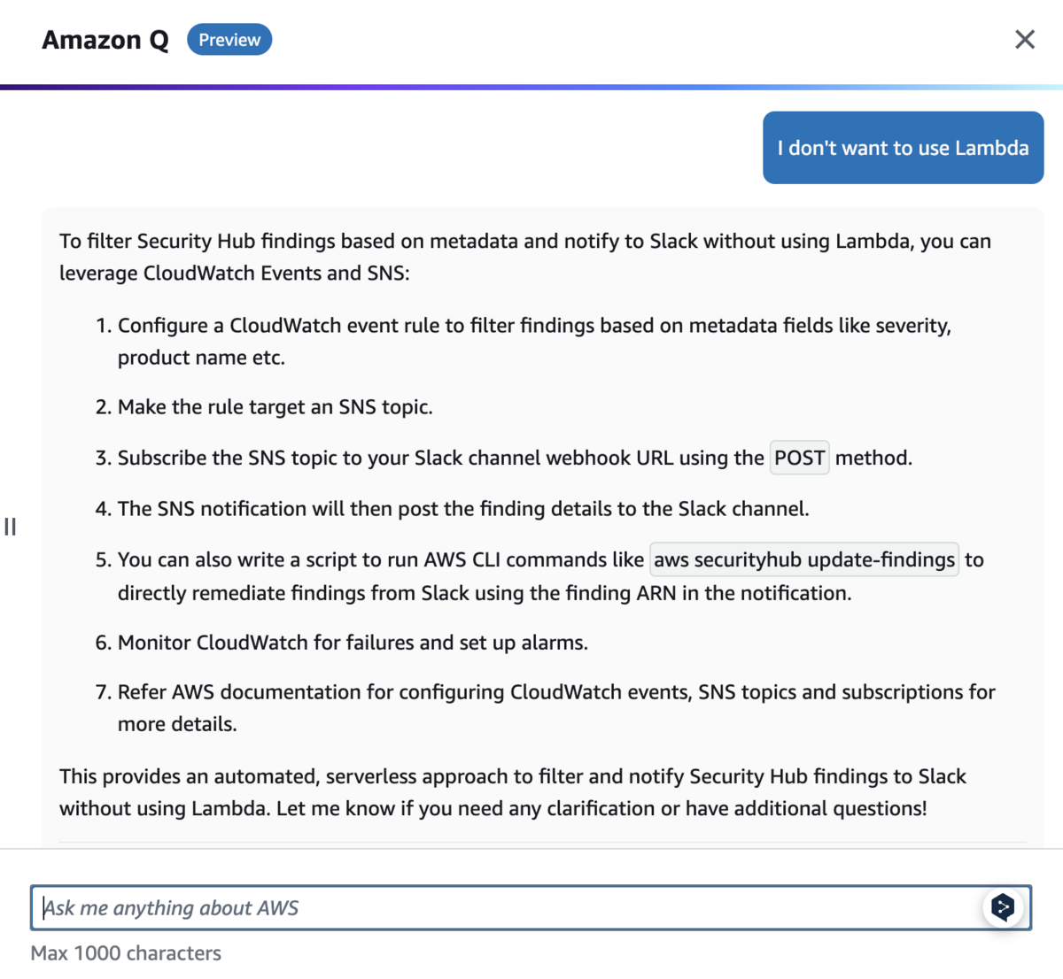 ほうほう、手順を示してくれるパターンです。Amazon EventBridgeあたりをしっかり提案してくれるのは、AWSに不慣れな人にとってはとても親切ですね!